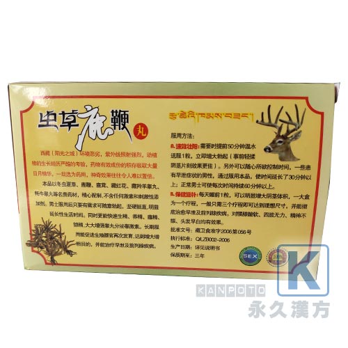 虫草鹿鞭丸は中国古来から伝わる高級漢方薬材冬虫夏草を主原料とする画期的な性機能改善、精力増強剤です。最先端の超臨界技術を使用し生薬成分が極めて素早く体内に吸収され効果を発揮するように作られています。化学薬品のような副作用、依存性が全く無く、日々の健康にも非常に有益な製品です。虫草鹿鞭丸の用法・用量