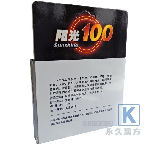 新陽光100は多種な男性元素を含む。速く精力を補うことができる。新技術で効果時間を大幅に拡大。生活質量を改善し、アップする。第二次発育を増進することができる。特に腎虚で虚弱体質の方に適応する。こうした代謝機能の正常化作用にはもう一つの側面があり、「疲れた五臓を活発化させることにより、性的機能を回復させる効果がある」というものです。腎臓の息の不足の引き起こす神経衰弱に用いて、優れた血の方虚、陽がしぼんで、もっと前に下痢をして、夢精するのが遺精する、腰の酸っぱい足柔らかくて、かたくないこと、腎臓を挙げるのはびくびくして湿っていて冷たくて、前立腺炎、前立腺は増殖する(大きい)などの病気。