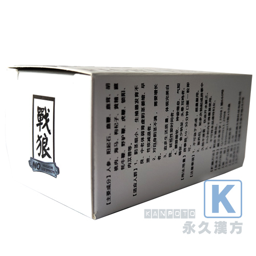 勃起不能、早漏、性欲減退、性交過多、男女性機能障害、倦怠感、腰や足が痛い、冷え症、夜間頻繁に尿意を催す、などに効果があります。戦狼の用法・用量