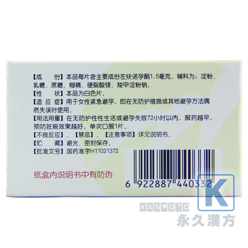 適応症:無保護性(いかなる避妊措置を採用しない)性生活後或いは避妊失敗後(例えばコンドームが抜ける、破れること、体外射精失敗、安全期の計算失敗等)72時間以内に意外妊娠を予防する措置。金毓亭(緊急避妊薬)の用法・用量