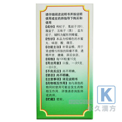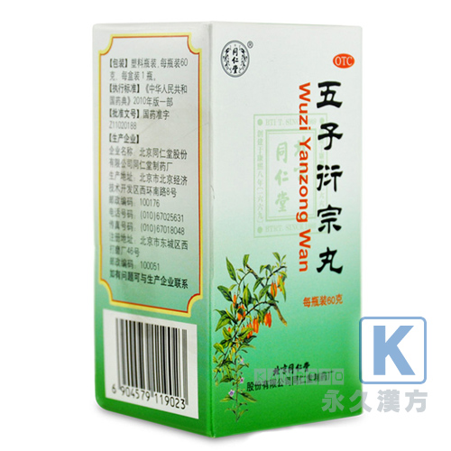 五子衍宗丸(同仁堂)は即効性がある製品ではなく、服用するにしたがって根本から改善する強精剤です。腎臓補強、性機能改善、遺精、インポテンツなどの治療に用います。漢方“伝統秘方”といわれる五種類の実(枸杞子、菟絲子、覆盆子、五味子、車前子)を主成分にしています。