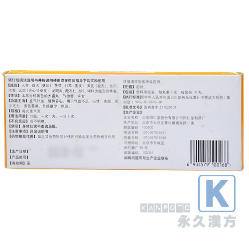 北京同仁堂から造られた黄褐色の水蜜丸と大蜜丸で、やや香りがあり、味が甘です。理気(気の流れを良くすること)、養血(血を増やすこと)、健脾(脾の働き(消化機能)を高めること)、養心(心の機能を高めること)の作用があります。