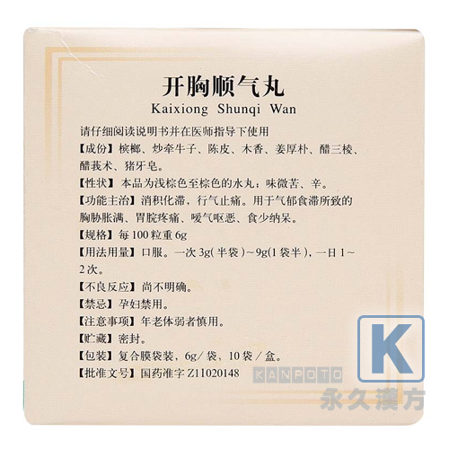 開胸順気丸は消化を促進する・止痛・食欲を促進するの作用があり;食欲不振、消化不良、げっぷ、胃痛、腹の膨満などに用います。開胸順気、停食蓄水;胸に用いる腹はいっぱい膨れて、消化不良で、嘔吐して吐き気がして、胃にもたれて貯水して、紅白の赤痢。