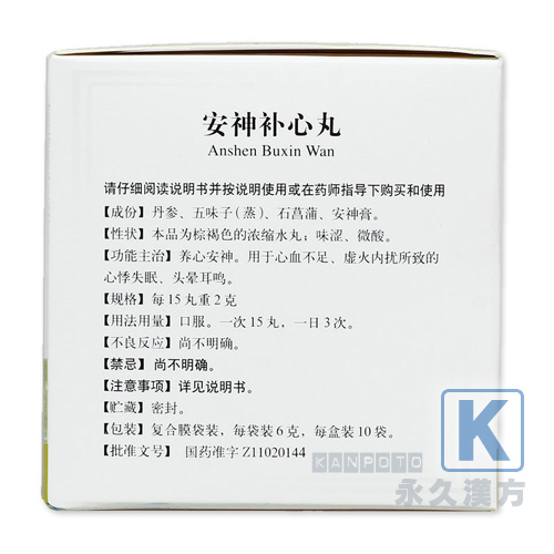 丹参、五味子、石菖蒲、合歓皮、墨旱蓮、女貞子、首烏藤、地黄、珍珠母、莵絲子など。安神補心丸の副作用