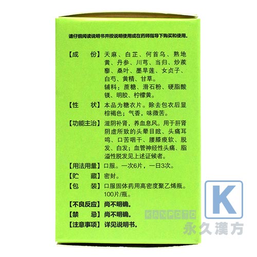 【対応病症】肝腎陰虚による眩暈、頭痛、耳鳴り、口が苦くて喉が渇く、腰膝だるさ、脱け毛、白髪、血管神経性頭痛、脂漏性脱毛症に対応。