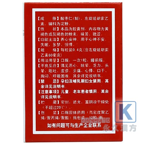 酸棗仁などの漢方薬材により開発された精神安定、安眠剤です。酸棗仁はサネブトナツメの成熟種子である。煎液には転生・催眠作用や鎮痛・抗痙攣作用・抗ストレス作用などが報告されています。