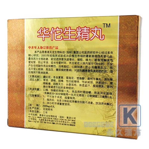華佗生精丸は伝説の幻の精力剤。あの三国の神医「華佗」によって作られたとの伝説がある古来の強精壮陽サプリです。体にやさしく効いてくれる精力剤。持続性、勃起度、抗疲労効果抜群。即効で硬く大きく硬くなります。早漏防止、硬さと太さを増強、即効性あり、効果は2時間持続。早漏防止効果もあり勃起時間も60分以上持続し、中折れがしない優れもので中高年の方には効果抜群です。