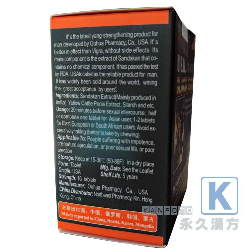 2007年に当製品はすでに米国の最高の薬品権威のある部門に精力をつける薬品を認定されて安心して服用する紳士になられて、いかなる副作用と依存性がなくて、現在すでに達して世界の各国を売ります。当品物は腎臓の機能を奮い立たせることができて、腎臓の活力を増加します。持って腎臓の精力をつける効果を補います。インポテンツ、早漏、性生活の質の低すぎる者、生殖器が充血した後に硬度の足りない者、時間きわめて短い者は適用します。